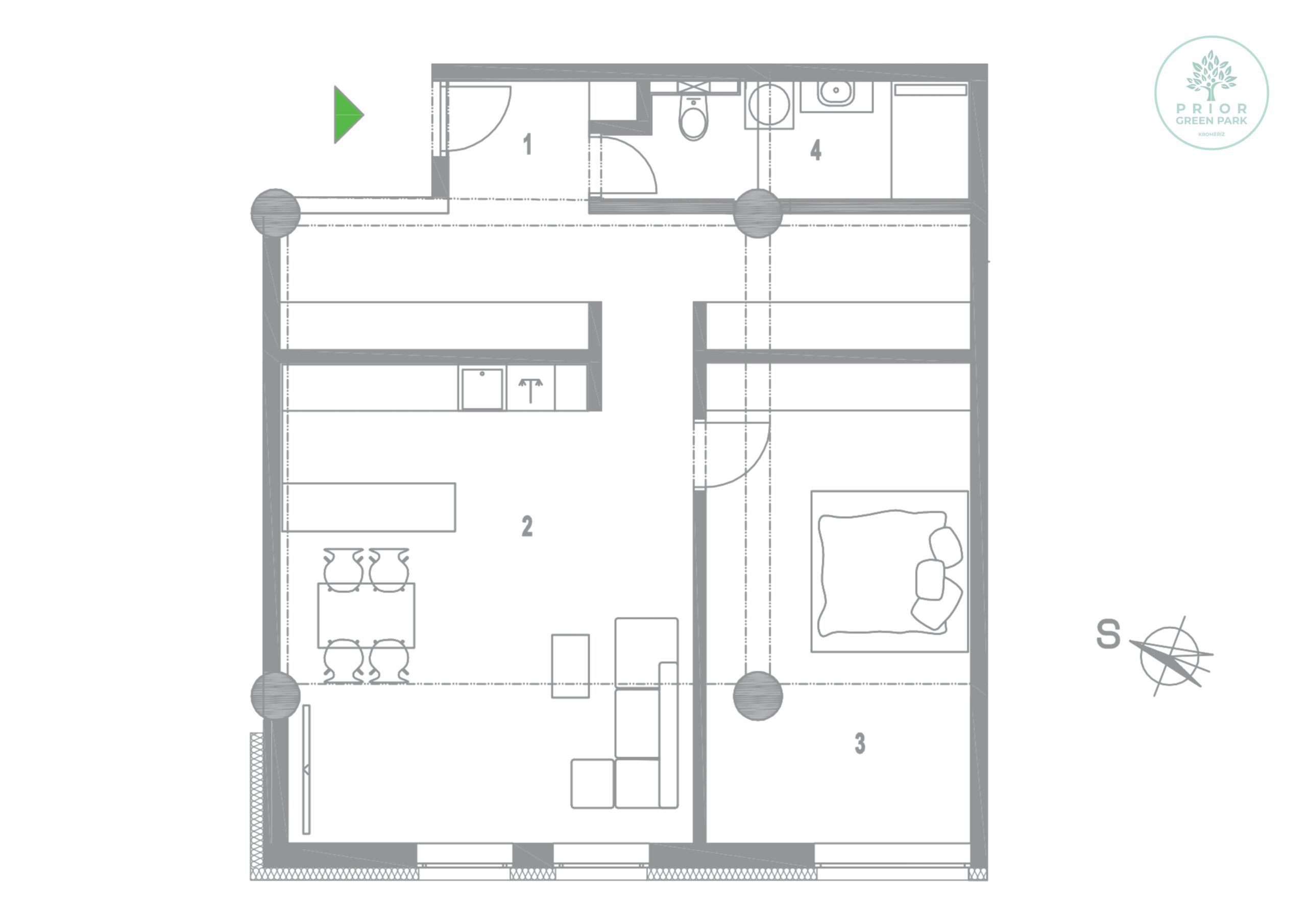 Schéma půdorysu bytu představuje předpokládané dispoziční řešení. Kuchyňské linky, nábytek a interiérové doplňky nejsou předmětem dodávky. Výměry jednotlivých místností jsou pouze orientační. Investor se tímto nevzdává práva na případné úpravy či doplnění marketingového materiálu.