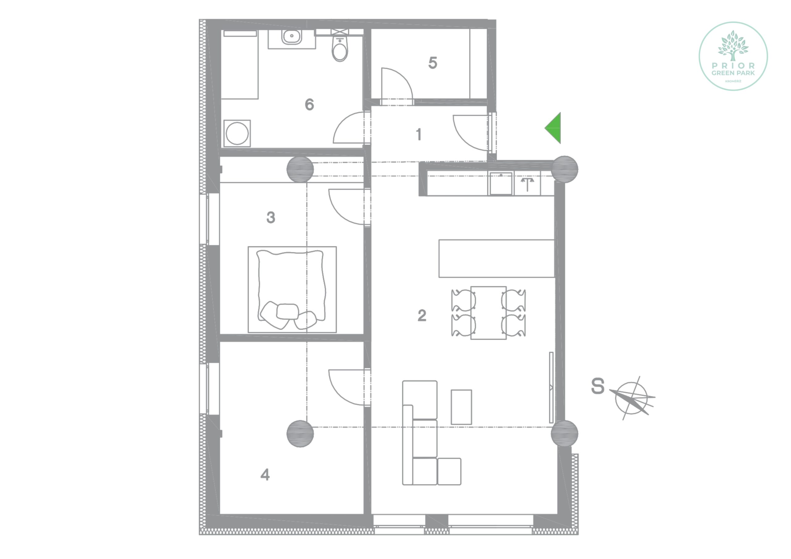 Schéma půdorysu bytu představuje předpokládané dispoziční řešení. Kuchyňské linky, nábytek a interiérové doplňky nejsou předmětem dodávky. Výměry jednotlivých místností jsou pouze orientační. Investor se tímto nevzdává práva na případné úpravy či doplnění marketingového materiálu.