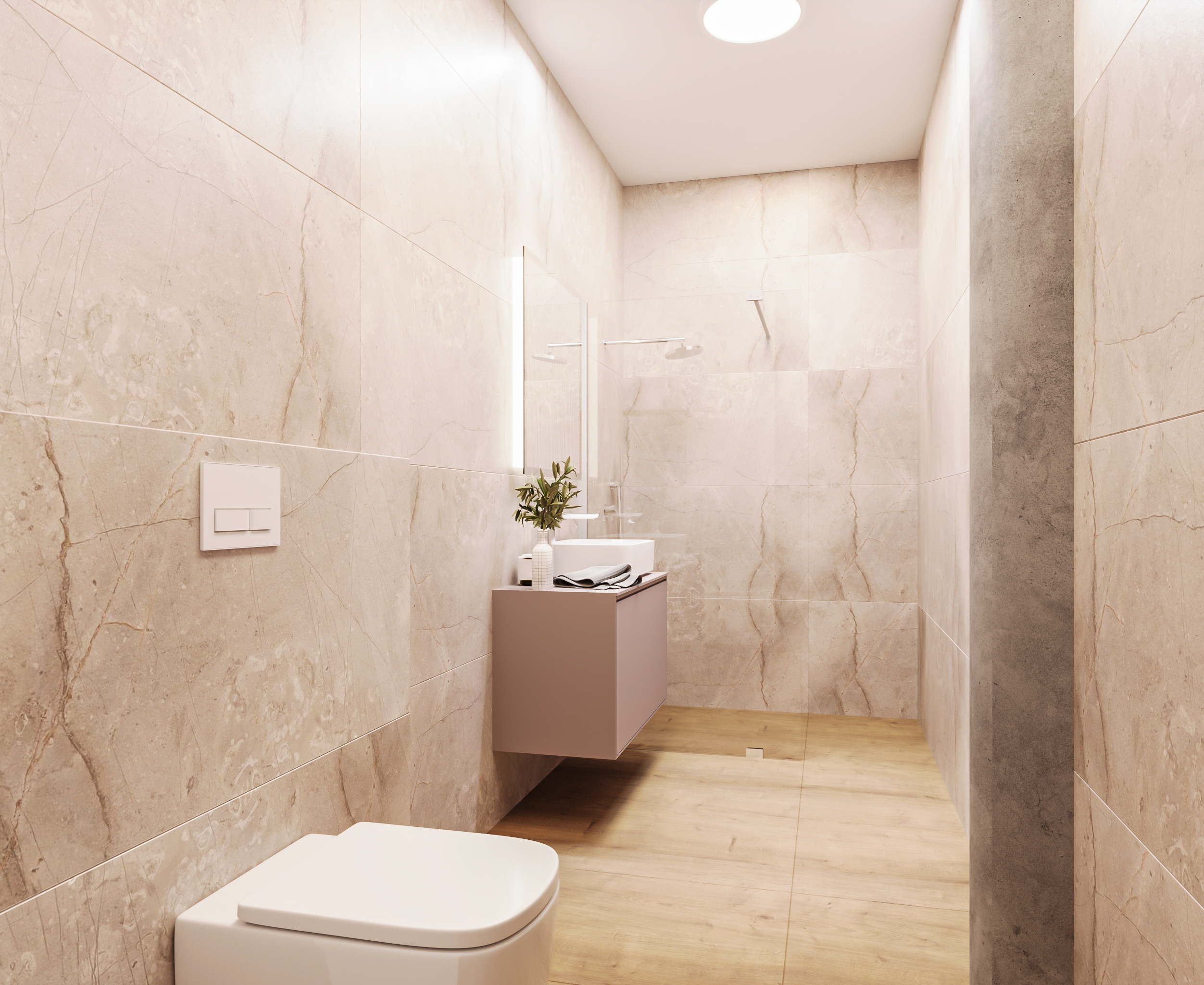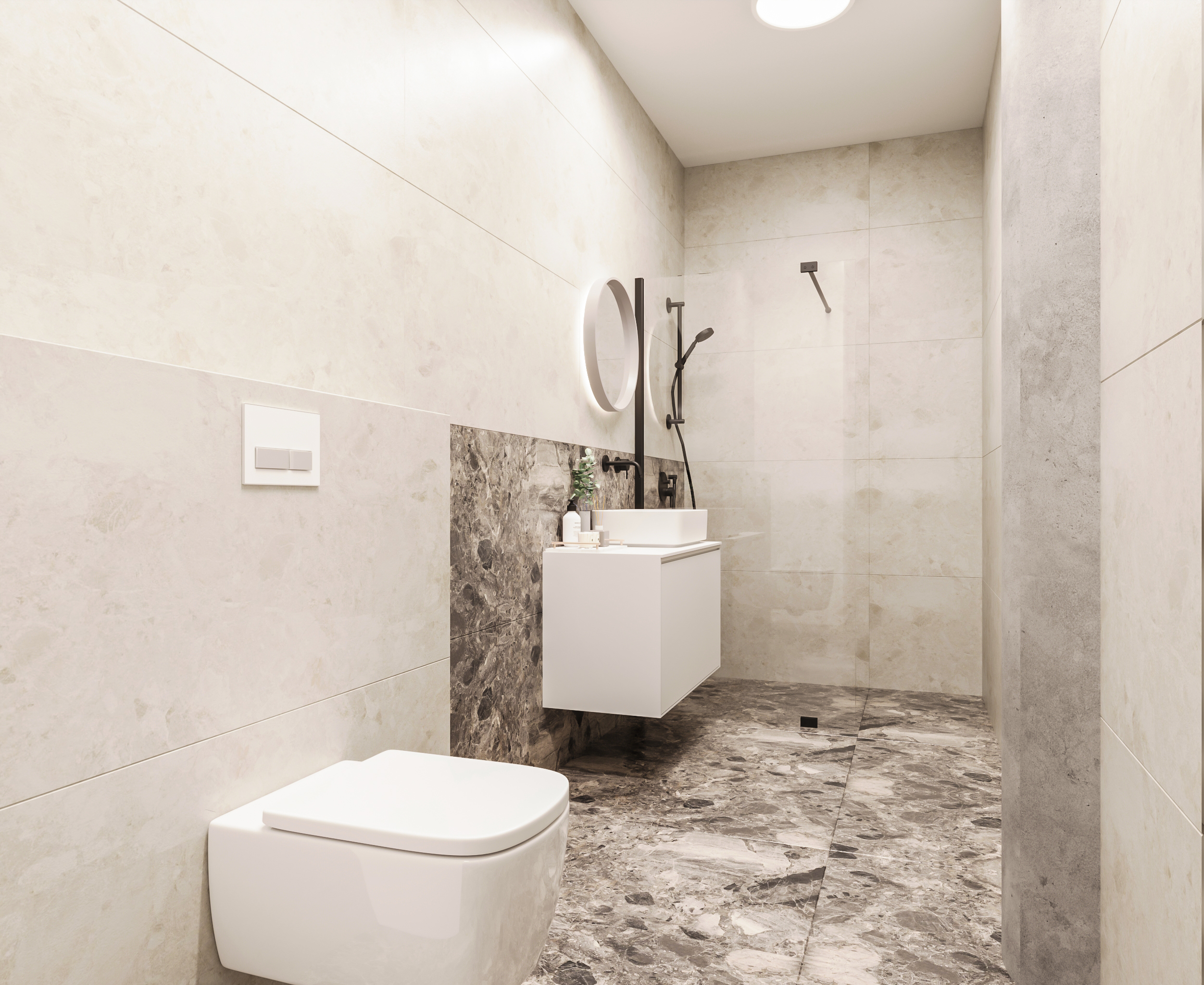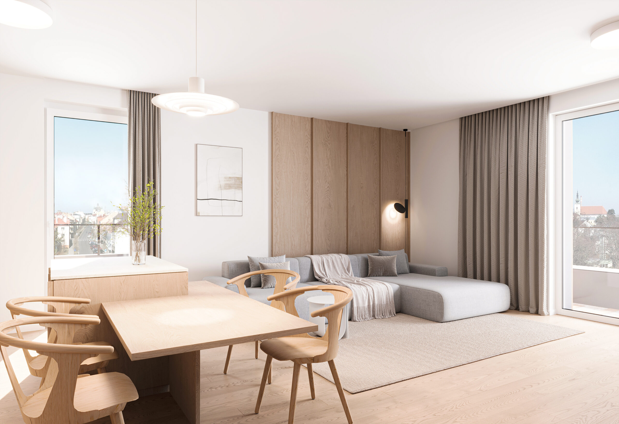 Užitná plocha bytu je uvedena v m² vnitřní užitné plochy. Půdorysné schéma znázorňuje předpokládané dispoziční řešení; kuchyňská linka, nábytek ani interiérové doplňky nejsou součástí dodávky. Rozměry jednotlivých místností jsou pouze orientační. Fotografie slouží jako ilustrační vizualizace budoucího stavu a nemusí přesně odpovídat realitě. Investor si vyhrazuje právo kdykoli upravit nebo doplnit tento marketingový materiál.